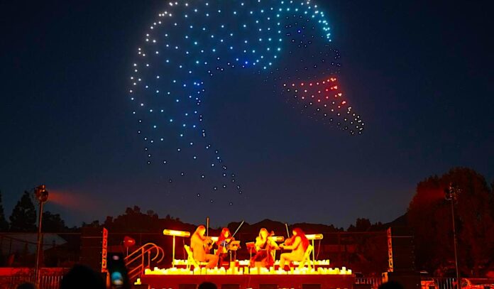 As night falls, hundreds of synchronized illuminated drones take off and create shapes in the sky, moving in time with live classical music in a 65-minute performance.